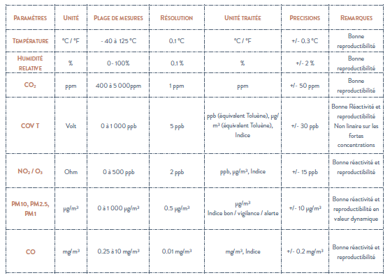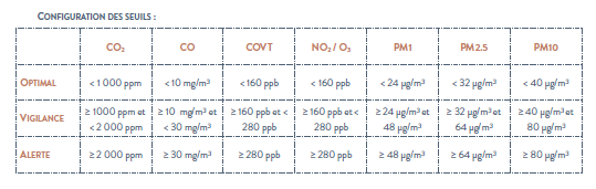Les seuils sont établis tout d’abord en fonction de l’usage de l’espace, concrètement un logement n’est pas traité de la même manière qu’un Open-Space. Nous nous appuyons également sur les valeurs guides définies par les autorités publiques et les valeurs d’orientation de l’OMS. Il est à noter que les seuils évoluent selon la visualisation souhaitée, en effet le seuil s’adapte en fonction de la durée d’exposition, c’est à dire que la visualisation des données sur 1 jour, 1 semaine, 1 mois ou 1 année est agrégée pour fluidifier la lecture et la compréhension des résultats.